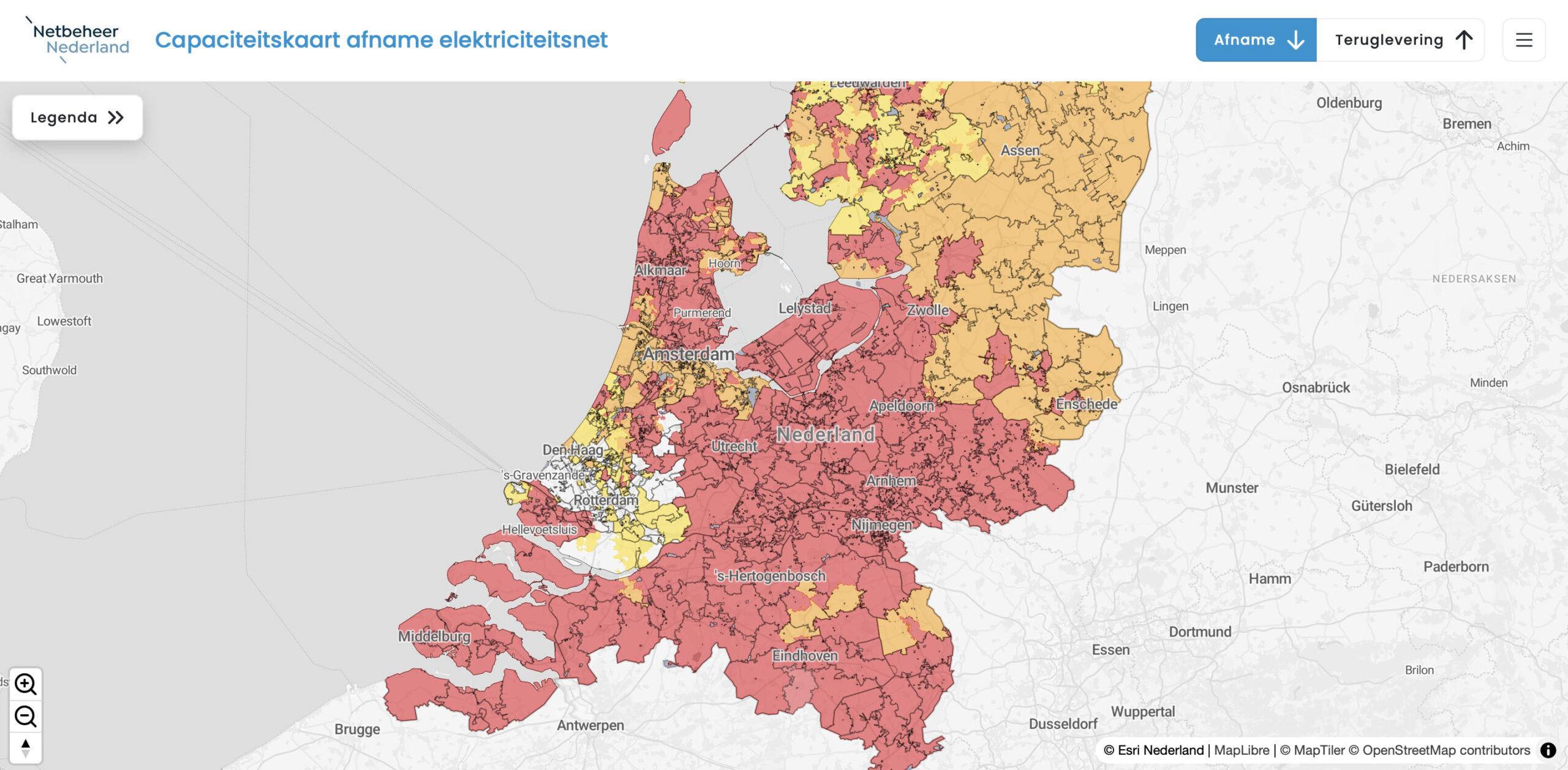 In afbeelding 1 is de Landelijke Capaciteitskaart (afname; situatie van juni 2024) weergegeven. Deze kaart geeft inzicht in de beschikbare ruimte op de elektriciteitsnetten van de regionale netbeheerders voor een netaansluiting groter dan 3x80A. In de rode gebieden is geen transportcapaciteit beschikbaar volgens de netbeheerders. De situatie voor invoeding van duurzaam opgewekte elektriciteit is overigens vergelijkbaar. Voor de actuele situatie voor zowel afname als invoeding van elektriciteit zie https://capaciteitskaart.netbeheernederland.nl/