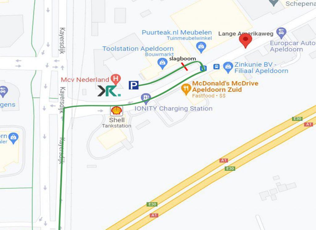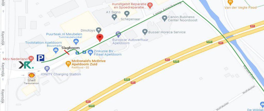 Via A1: Neem afslag Apeldoorn Zuid. Sla linksaf op de Kayersdijk. Sla rechtsaf de Lange Amerikaweg op. Sla na 200 meter linksaf de parallelweg op.