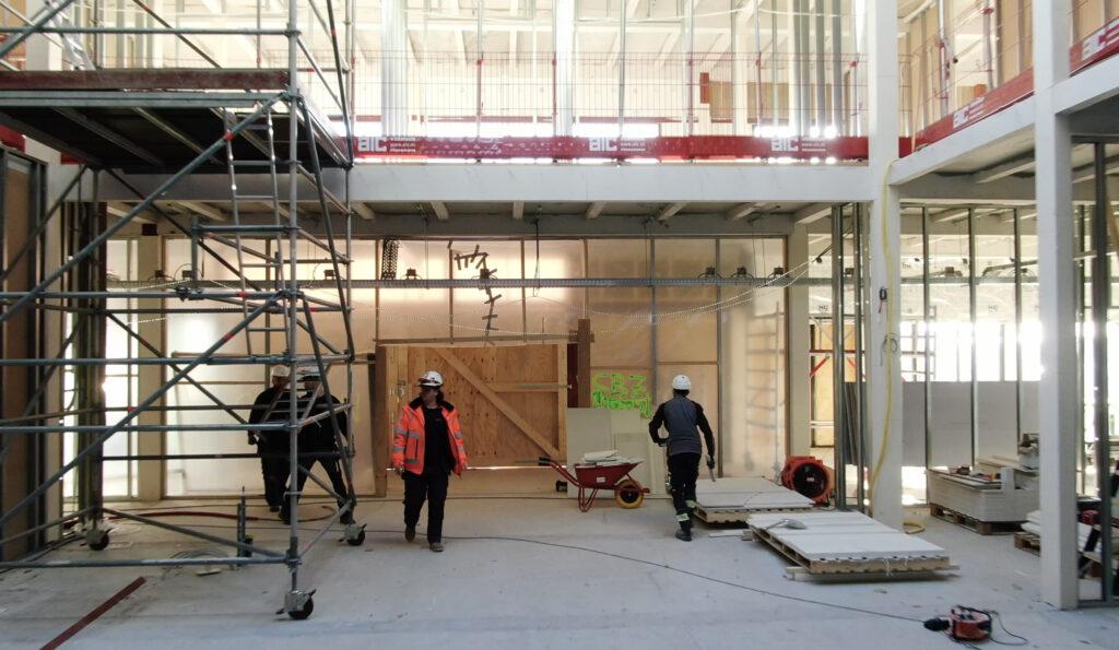 De bouw van Dicoon gaat hard. De buitenzijde is zo goed als klaar. De gevels zijn opgemetseld en zelfs al voorzien van beplating. Binnenkort breekt daarom de afbouwfase aan. Dan wordt de technische installatie geplaatst en worden de laatste muren en plafonds opgebouwd. De contouren van de kantoren en entree zijn dan ook een stuk duidelijker.